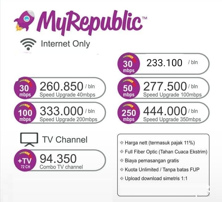 Internet MyRepublic memberikan segalanya yang Anda butuhkan. Bandwidth berlimpah, tanpa batas kuota, tanpa FUP dan 100% teknologi fiber optik. Menyediakan paket bundling dengan TV kabel yang membuat hiburan semakin lengkap.
